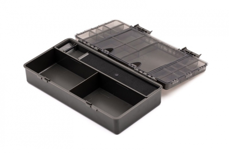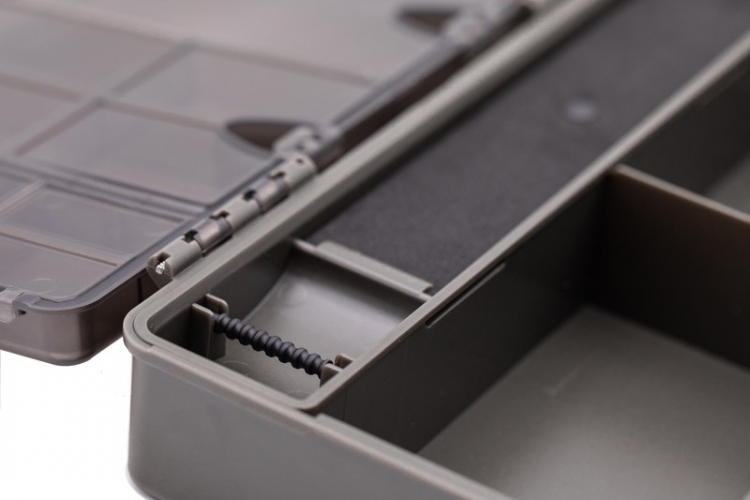 Vo vnútri veka sa nachádza 21 malých uzatvárateľných priehradiek rôznych veľkostí, ideálnych na uloženie komponentov ako lead klipy či obratlíky. V spodnej časti boxu sú dve väčšie priehradky s pevnými deliacimi stenami, ktoré poskytujú priestor pre montážne nástroje, cievky s nadväzcami a ďalšie príslušenstvo.