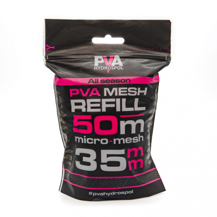 PVA Hydrospol Refill 50 m je náhradná PVA micro-mesh pančucha s priemerom 25 mm, ideálna na dopĺňanie prázdnych tubusov. Táto pančucha je pletená z kvalitných japonských vlákien do hustého micro-mesh úpletu, ktorý zabraňuje prepadávaniu sypkých materiálov, drobných pelet alebo nadrvených boilies.